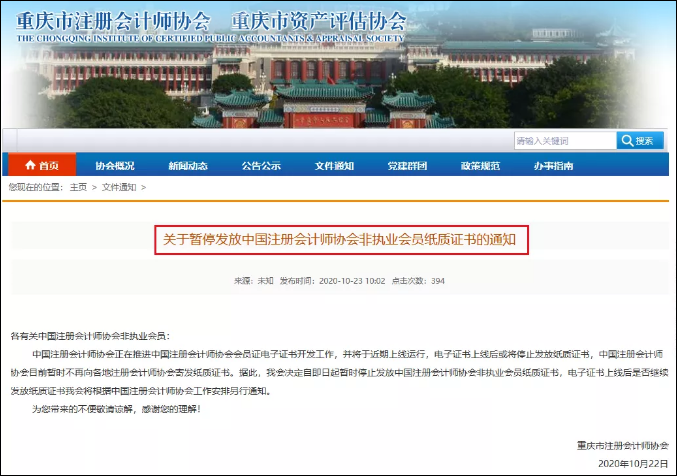 2020年10月,重庆注协就发布《关于暂停发放中国注册会计师协会非执业会员纸质证书的通知》,这份通知也透露了中注协可能将不再发放纸质版的非执业注册会计师证书。