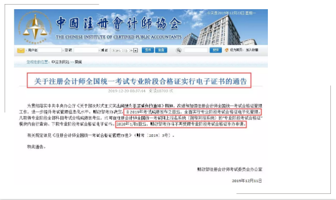 2019年12月,中注协发布《关于注册会计师全国统一考试专业阶段合格证实行电子证书的通告》。